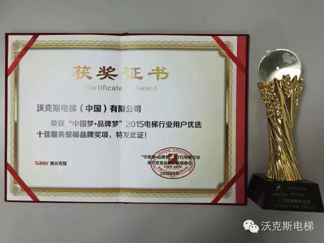 在剛剛結束的“中國夢?品牌夢”2015電梯行業用戶優選品牌評選頒獎盛典上,沃克斯電梯通過激烈的競爭角逐,憑借過硬的質量和貼心的服務,再次從諸多整梯品牌中脫穎而出,榮獲2015電梯行業用戶優選十佳服務整梯品牌稱號。